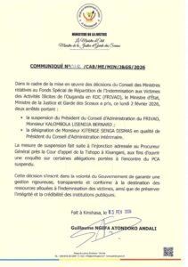 Dans un communiqué publié mardi 3 février, le ministère annonce la suspension de Bernard Kalombola Lisendja, président du Conseil d’administration du FRIVAO, et la nomination de Dismas Kitenge Senga comme PCA intérimaire.