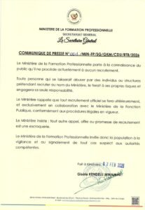 Cette mise au point vise à protéger les citoyens contre les tentatives d’escroquerie, souvent liées à de prétendues offres d’emploi exigeant des paiements ou des démarches irrégulières. Le Ministère de la Formation Professionnelle invite ainsi la population à faire preuve de vigilance et à se référer uniquement aux canaux officiels pour toute information relative à l’emploi et au recrutement.
