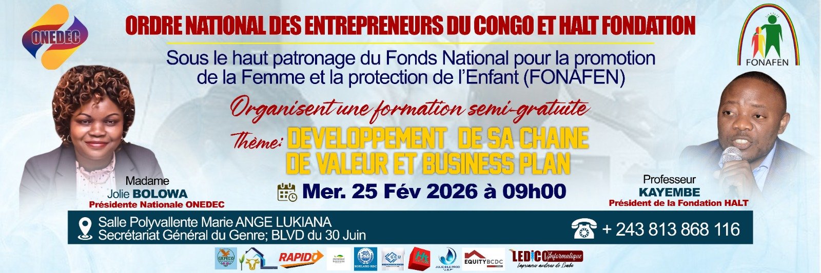 Malgré le potentiel économique considérable de la RDC, de nombreuses entreprises locales peinent encore à se structurer et à assurer leur pérennité. Pour répondre à ce défi, l’ONEDEC et la Halt Fondation organisent, le mercredi 25 février 2026 à 09h00, une session de formation intensive axée sur le thème : « Développement de sa chaîne de valeur et Business Plan ».